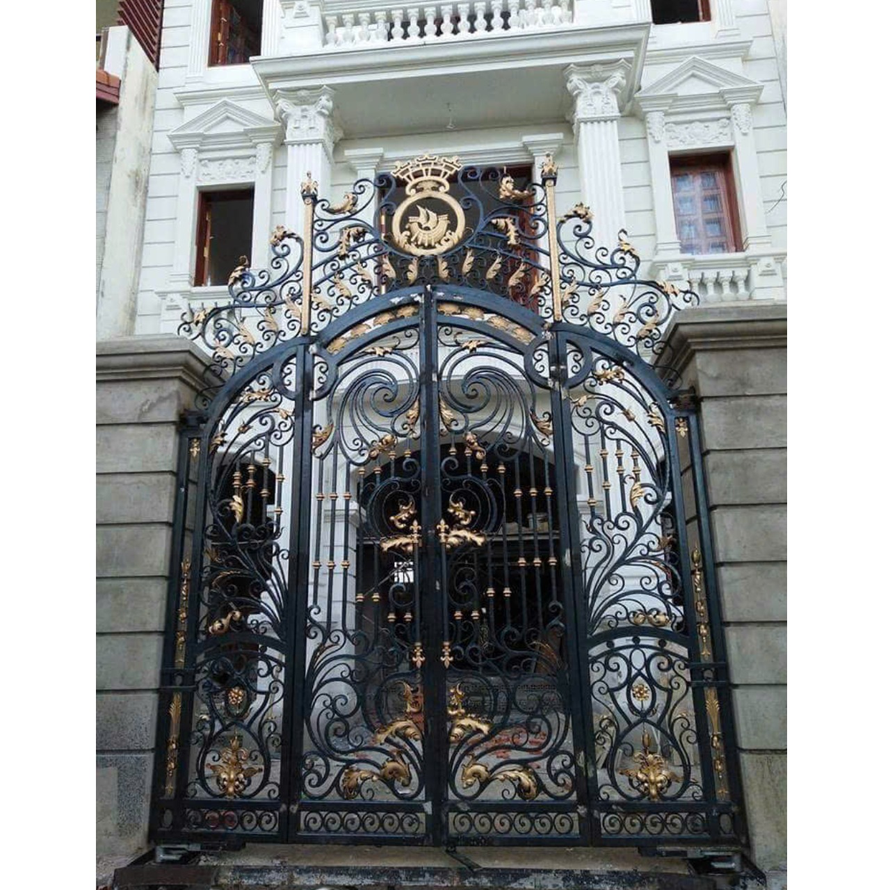 Điểm nhấn nổi bật của mẫu cửa này chính là các hoa văn gang đúc được điểm xuyết bằng sắc vàng đồng tinh tế. Những chi tiết ánh kim không chỉ làm nổi bật vẻ đẹp của cửa mà còn thể hiện sự sang trọng và đẳng cấp trong từng đường nét.